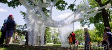 Inspired by tape-lace crochet, the pavilion uses over 30,000 recycled plastic cups bound by zip-ties to form a densley-knit serpentine structure. A lacy infill of cups between the tape structure and branches of the trees creates an outdoor room. The Pavilion will be assembled on Governors lsand in the spring of 2014 and will be on display all summer long.