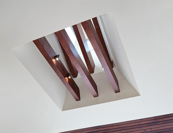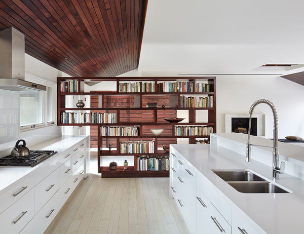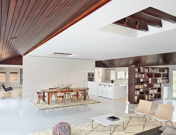 In response to both the spectacular surrounding landscape and a desire to improve energy performance, a highly insulated envelope was developed. The envelope was finished in a horizontal open-joined rainscreen with cedar boards charred using the traditional Japanese Shou-sugi-ban burning method. This technique was also used internally on sloped ceiling planes, walls and screens. Concealed lighting and mechanical systems were introduced throughout the interior. To complement and enhance the existing terrazzo floors, lacquered cabinetry and polished stone finishes were employed throughout the new kitchen.